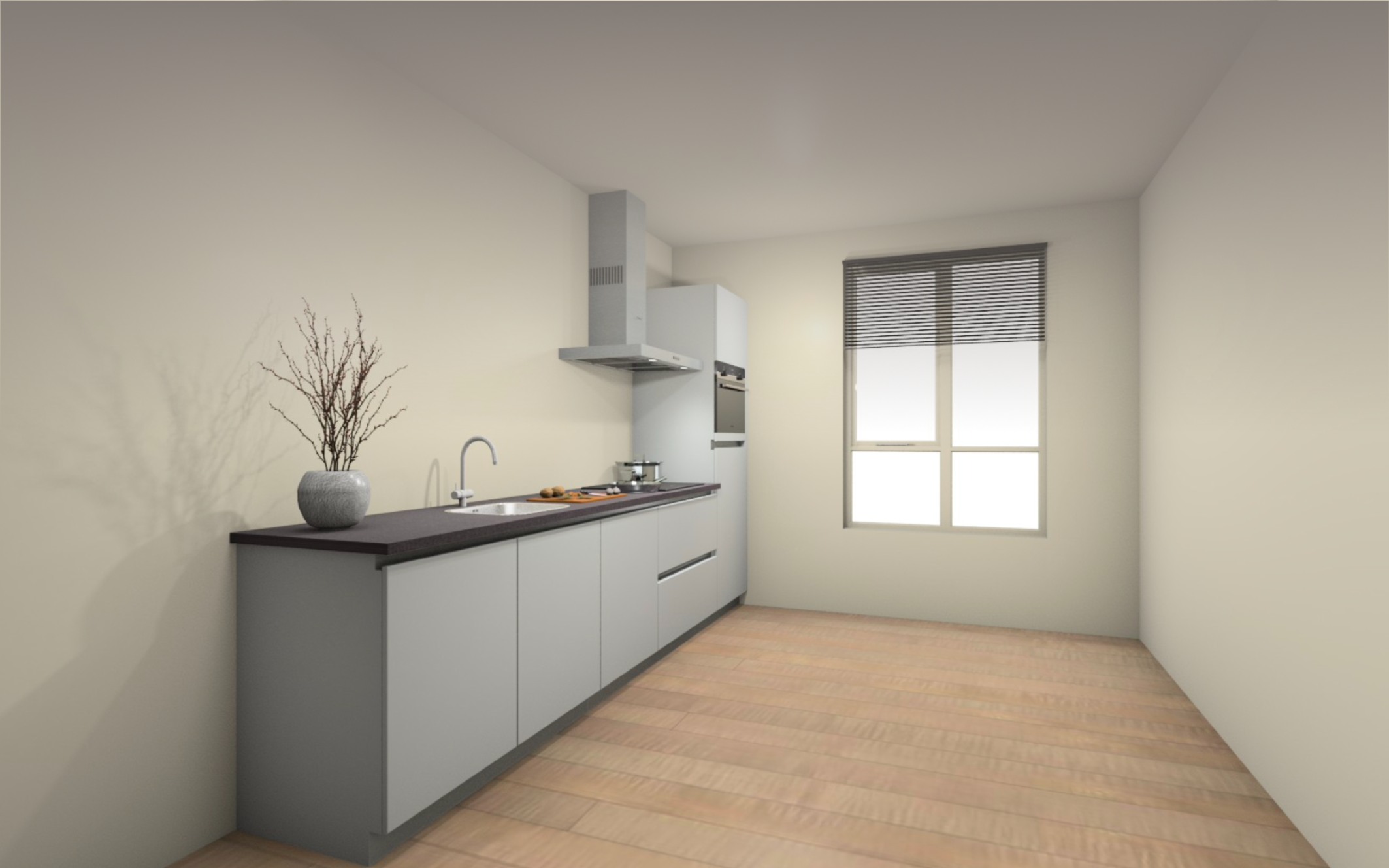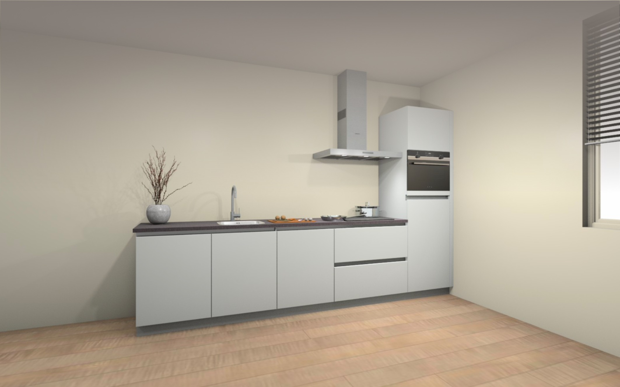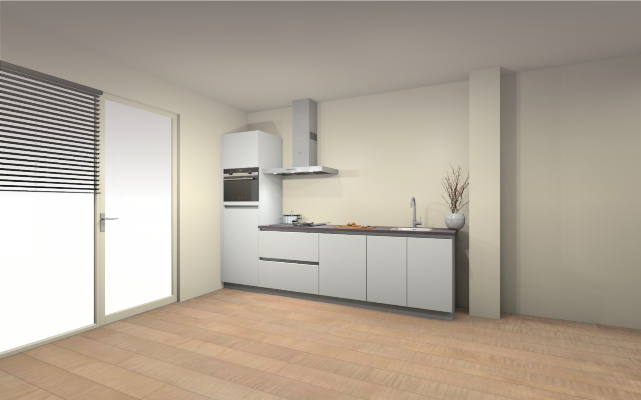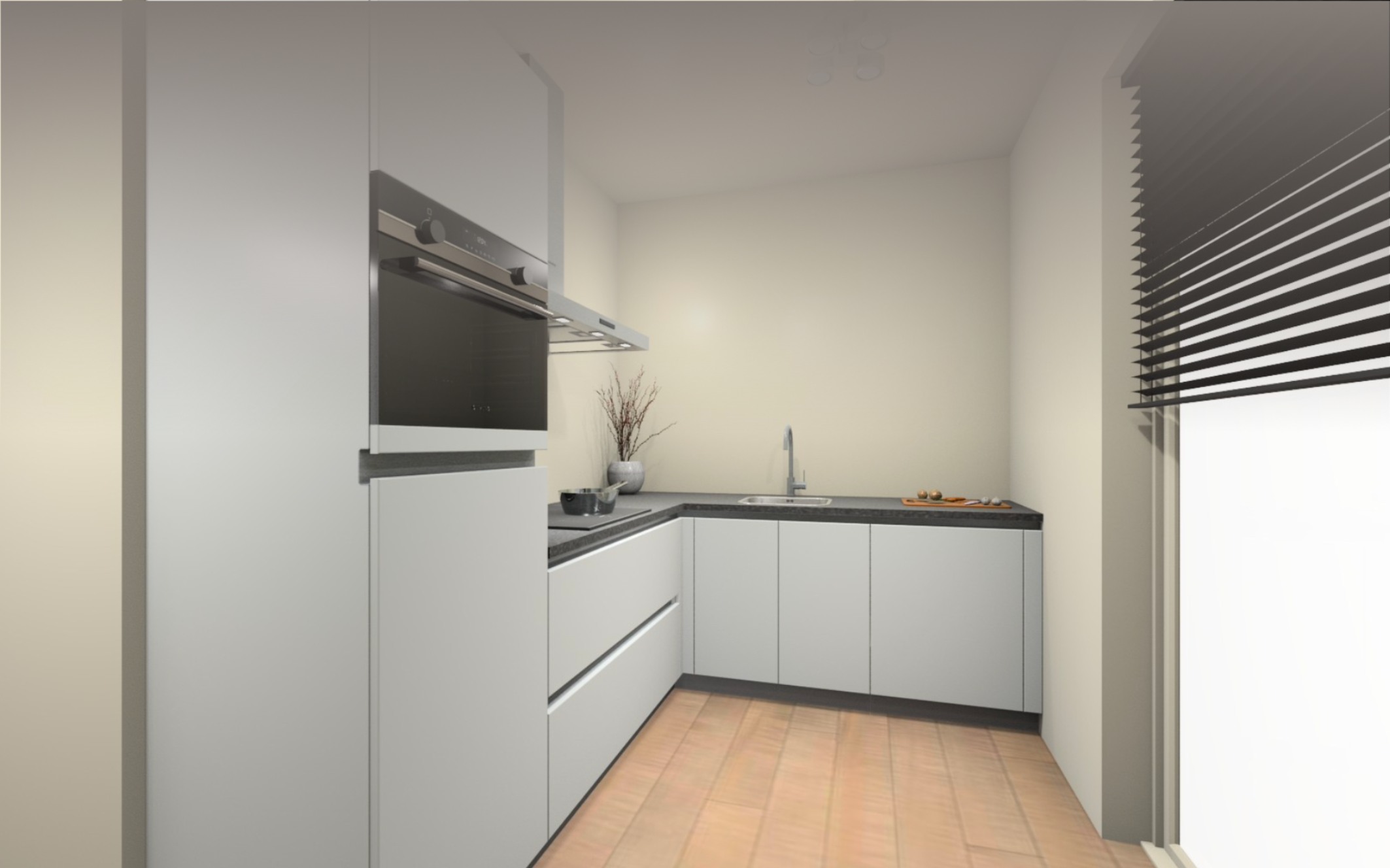 Vloer afwerking : Volledige woning een laminaat vloer, keuze uit 8 kleuren. Inclusief ondervloer en platte plint in bijpassende kleur.