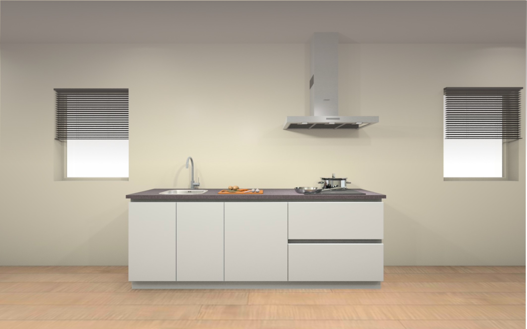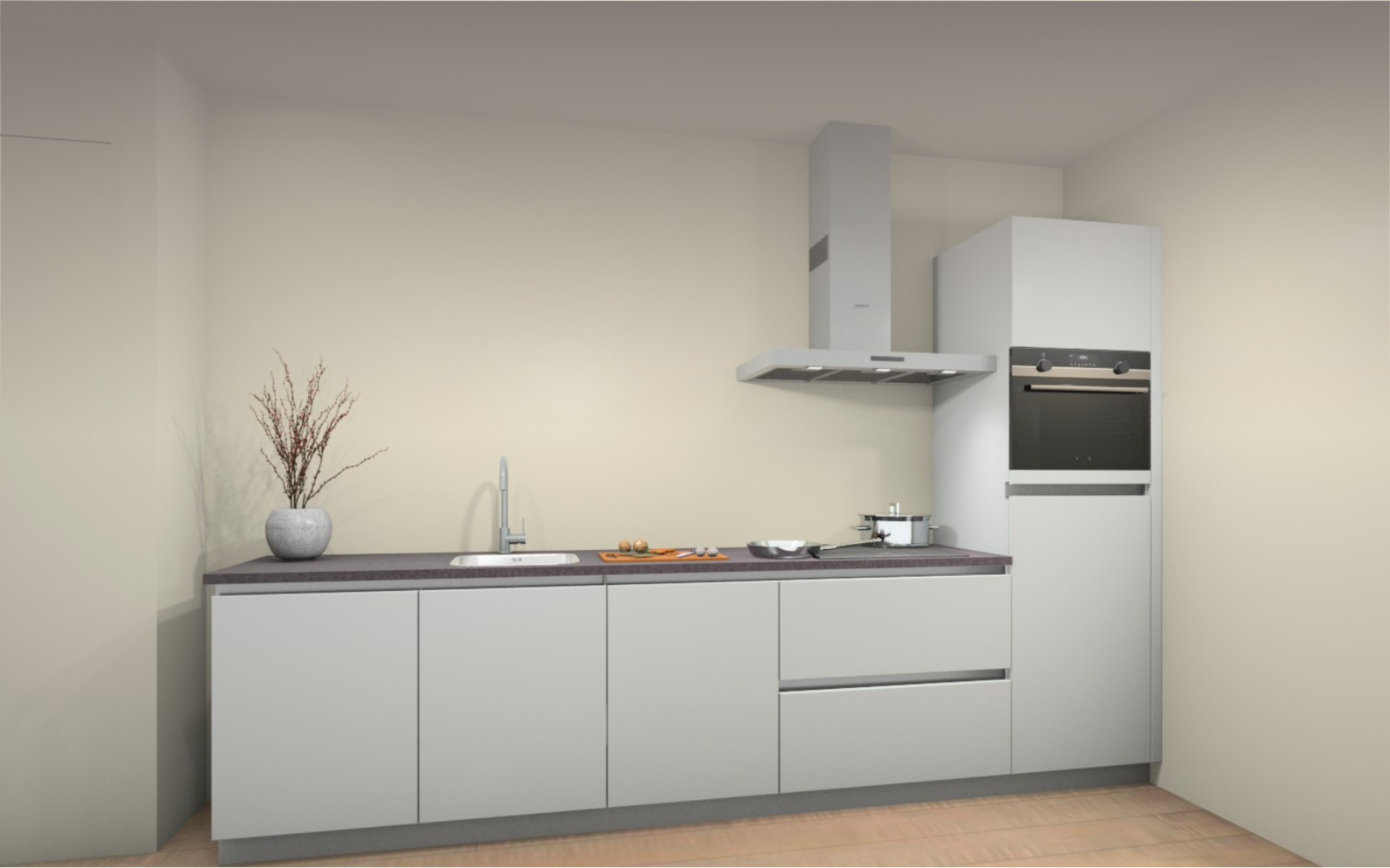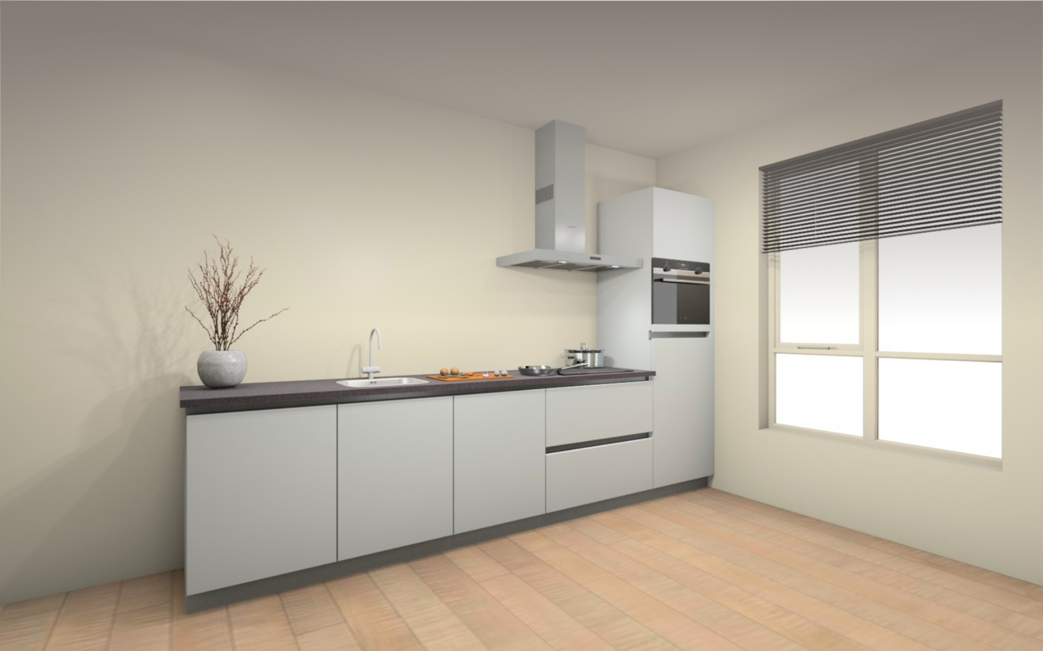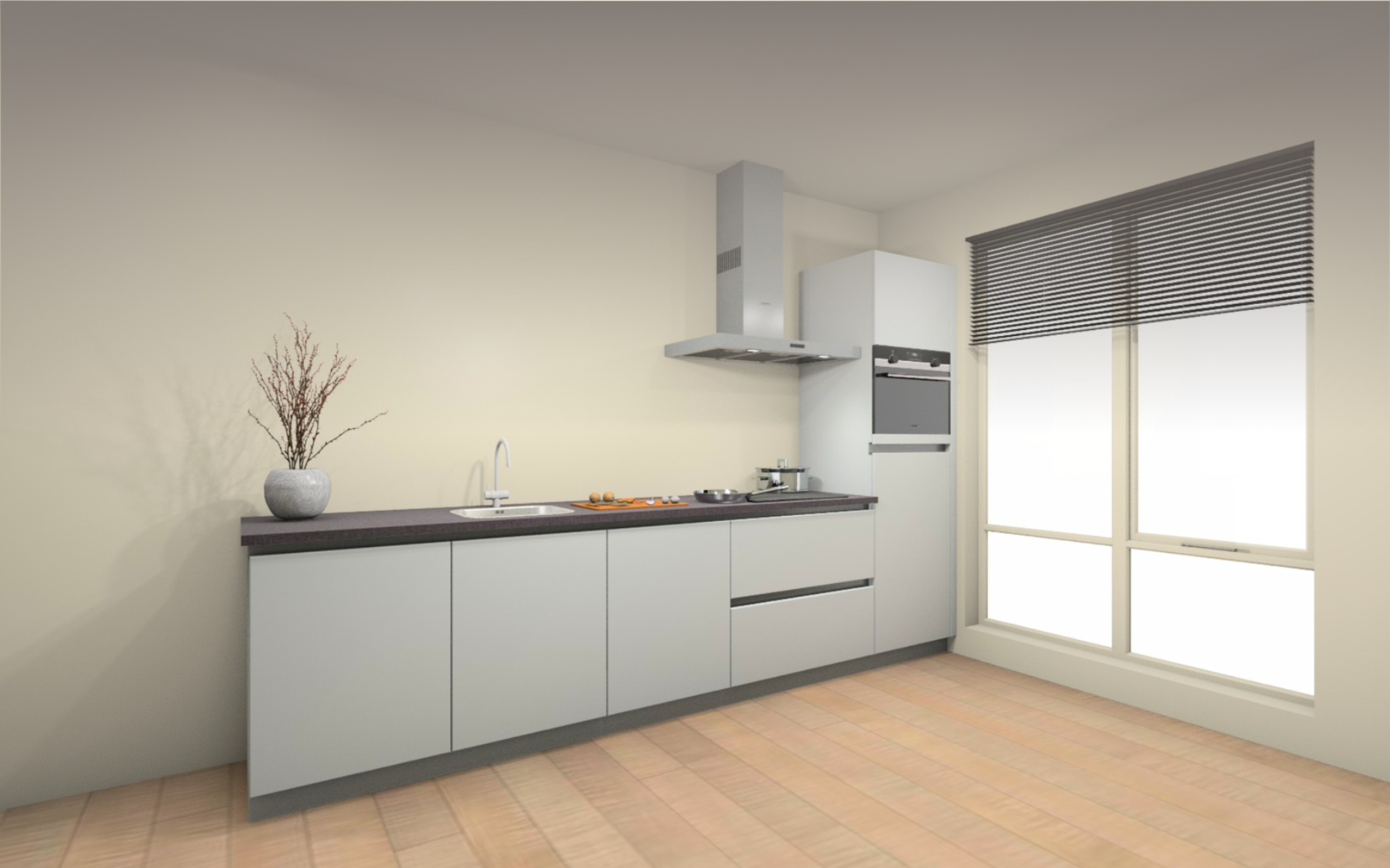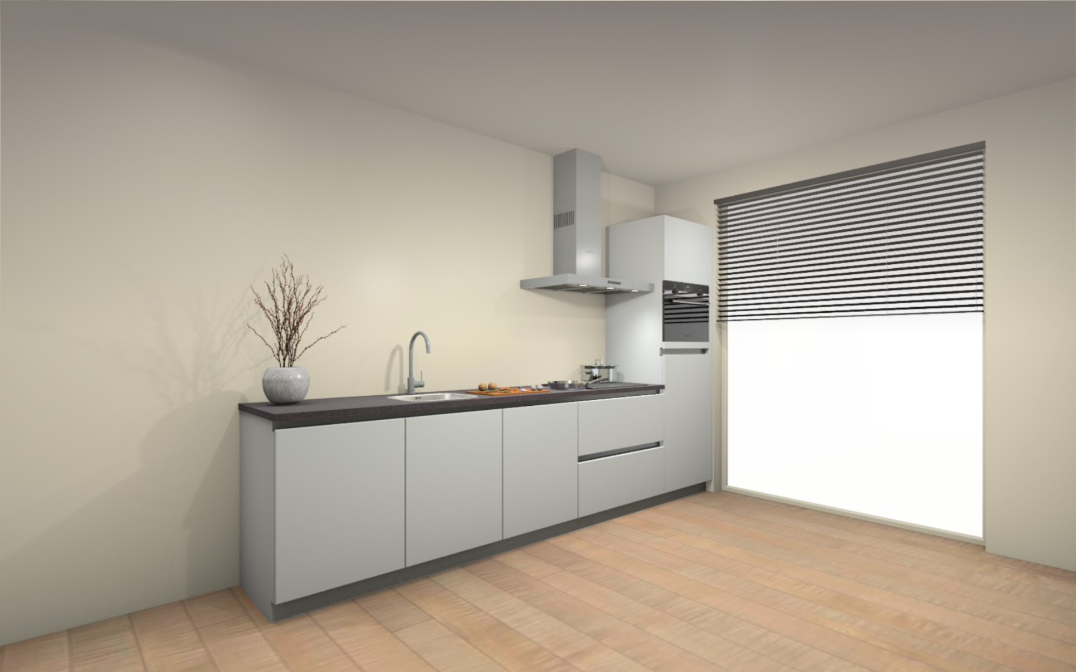 Vloer afwerking : Volledige woning een laminaat vloer, keuze uit 8 kleuren. Inclusief ondervloer en platte plint in bijpassende kleur.